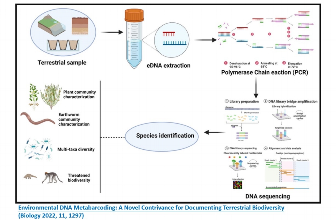 eDNA結合次世代定序技術 (Next Generation Sequencing, NGS),近年來在生態學、環境監測與生物多樣性研究中非常重要。高通量定序技術可快速且大量定序上百萬條DNA片段,而高靈敏度的特點,可偵測極微量DNA組成。