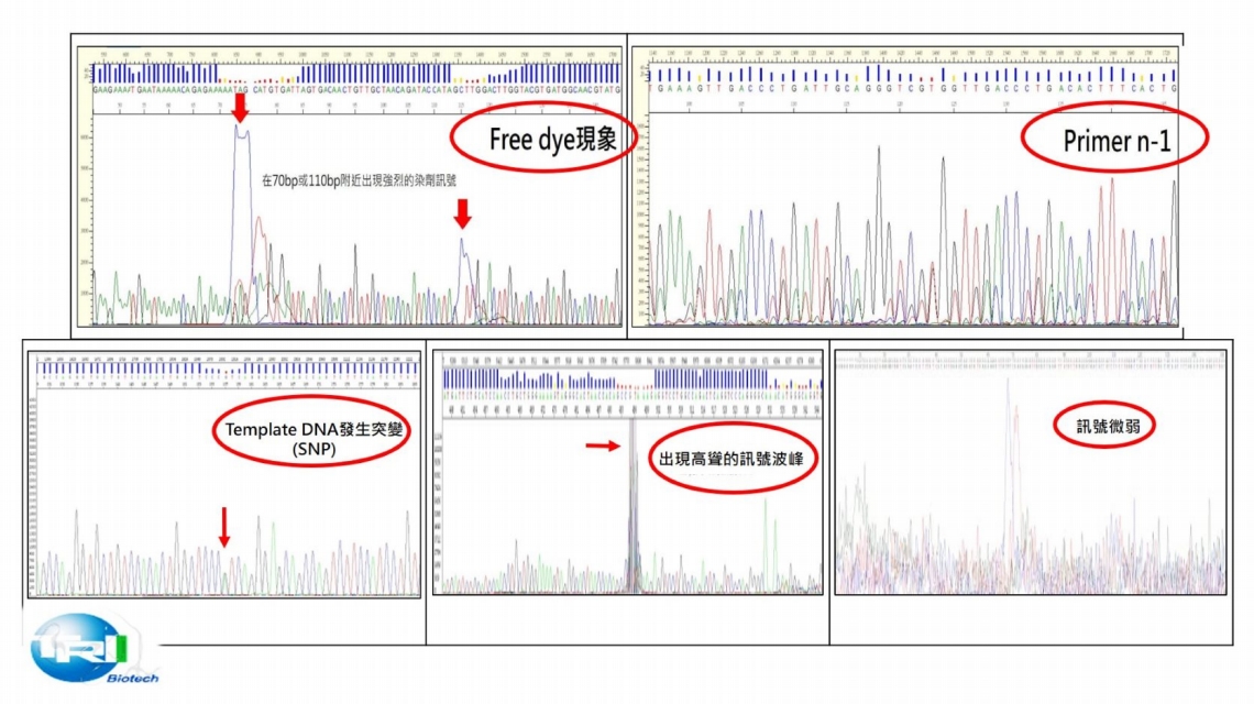定序結果在70 bp或110 bp附近出現強烈的螢光染劑訊號,可能是引子黏合Template DNA效果不佳或是螢光染劑殘留,造成訊號與背景值(S/N值)差異過小,而產生的現象。藉由增加Template DNA或是引子重新設計來增加訊號強度;以及定序反應試劑濃度調整並重新純化上機產物後可以有所改善!