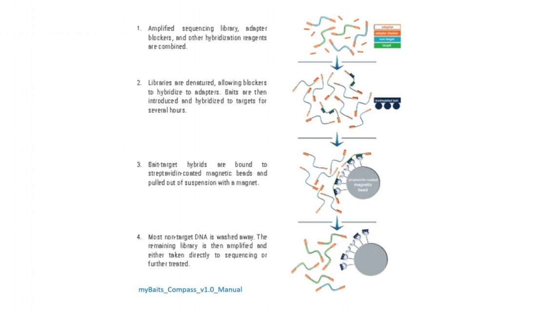 myBaits Compass採用了先進的「液相雜交捕獲技術」(hybridization capture technology)。這項技術就像是在雜亂的 DNA 文庫中加入專門設計的「特製探針(Baits)」,能精準鎖定並富集人類特定的 120萬個 (1.2M) SNP 位點。